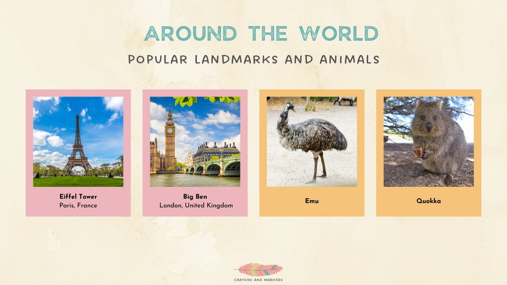 This resource includes 8 iconic landmarks and 8 typical animals for each continent, as well as the names of all continents for easy labeling. All images are high-quality and real, not illustrations, providing an authentic and engaging learning experience. Each continent is color-coded to match the maps available on George the Geographer's website, where they can be downloaded for free.